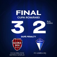 Echipa noastră a fost învinsă, scor 2-3, la penalty-uri, de CS Gloria 2018 Bistrița Năsăud și a fost eliminată din Cupa României. Partida s-a disputat în această după-amiază, de la ora 16:30, pe Stadionul ”Jean Pădureanu” Bistrița.